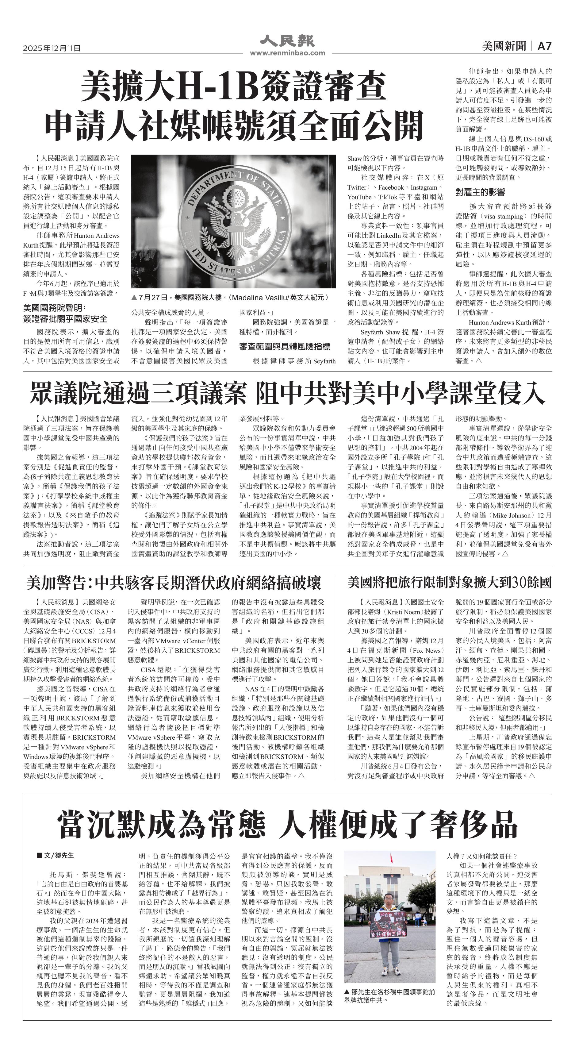 |<<  <<前一页 < 返回 第1042期  (2025年12月11日)A7版: 美国新闻 下一页>>  >>|