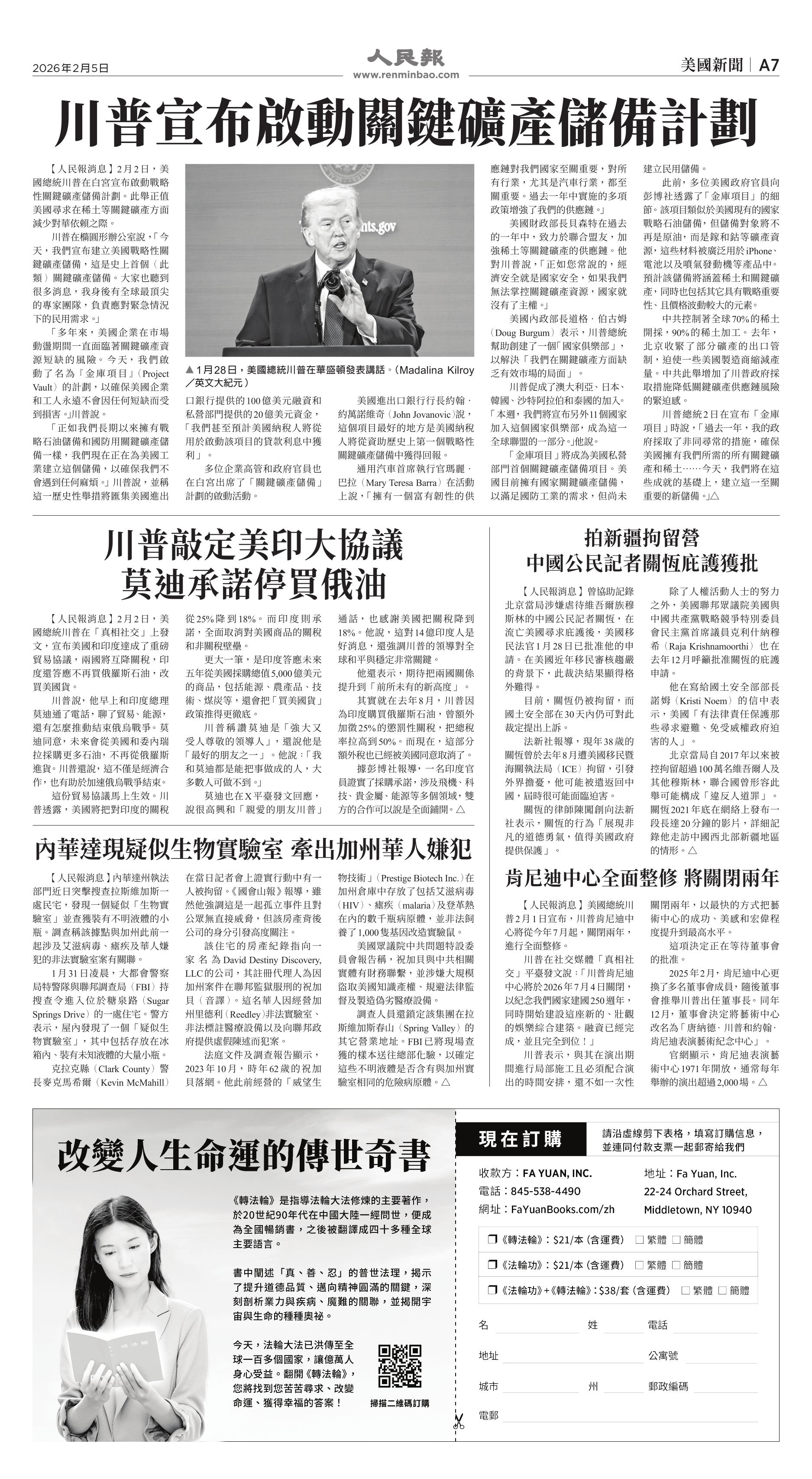 |<<  <<前一頁 < 返回 第1050期  (2026年2月5日)A7版: 美國新聞 下一頁>>  >>|
