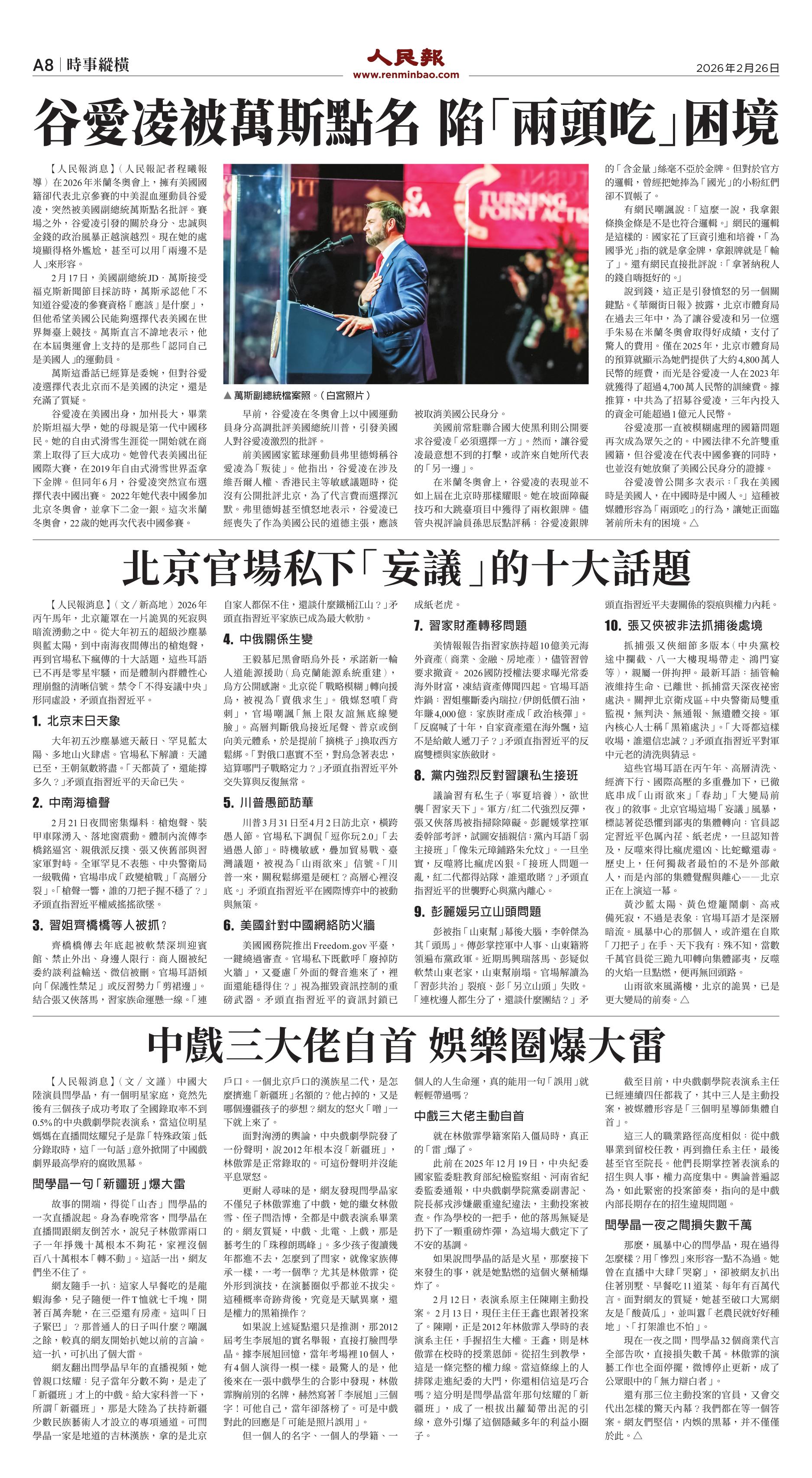 (2026年2月26日)A8版: 時事縱橫