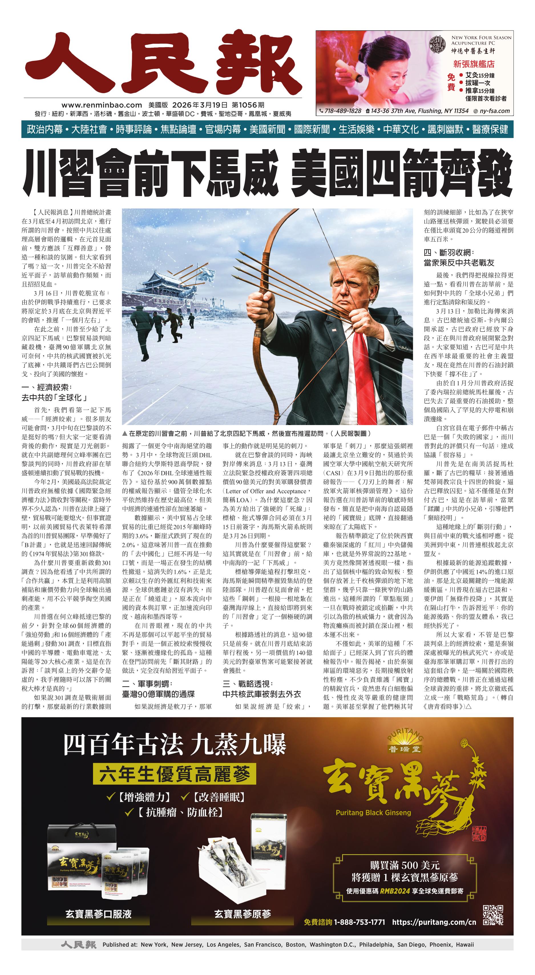 |<<  <<前一頁 < 返回 第1056期  (2026年3月19日)A1版: 頭版 下一頁>>  >>|