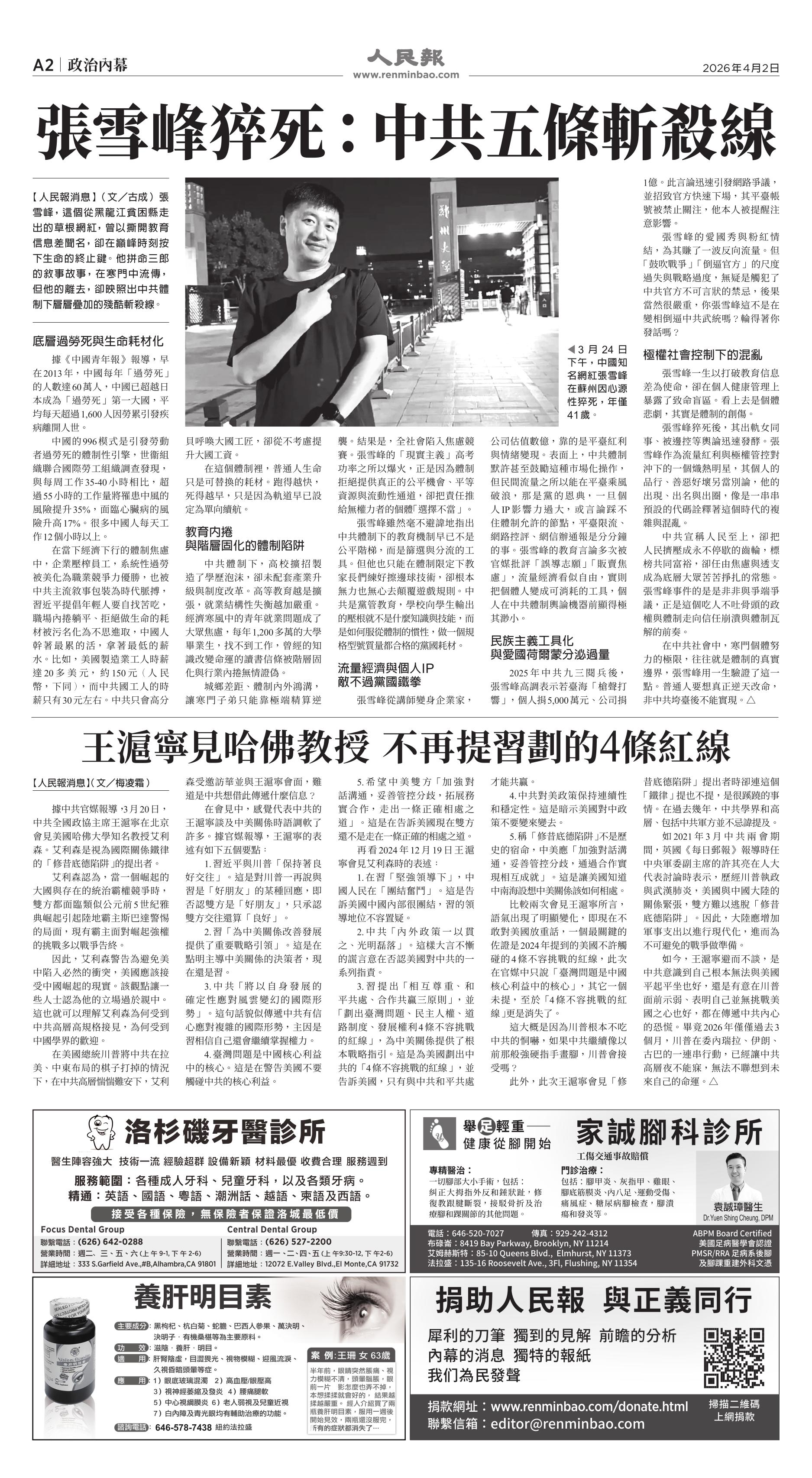 |<<  <<前一頁 < 返回 第1058期  (2026年4月2日)A2版: 政治內幕 下一頁>>  >>|