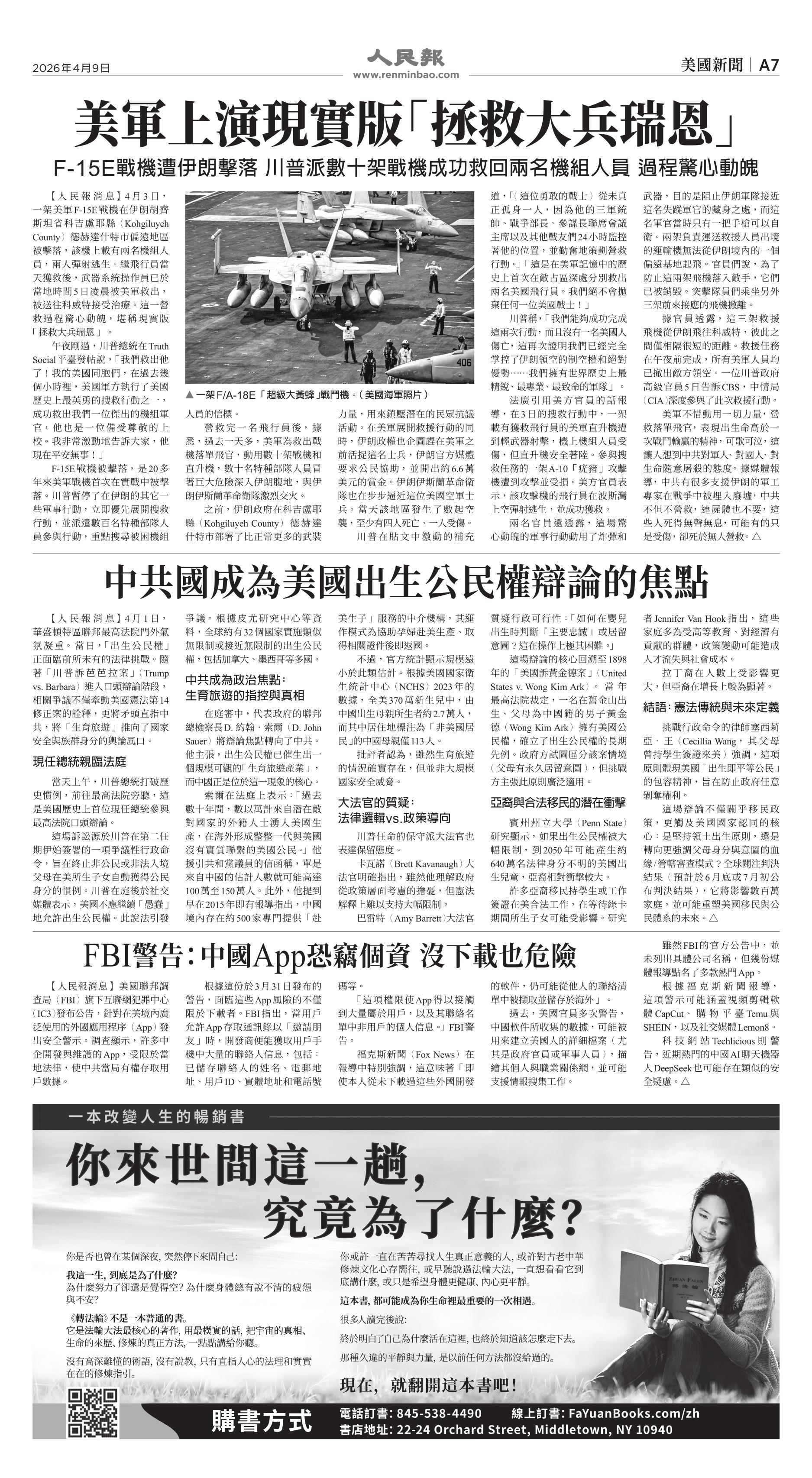 (2026年4月9日)A7版: 美國新聞