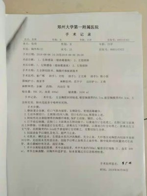 图为张琦2018年6月6日在郑州大学第一附属医院动手术的医疗记录,医生是胸外科主任崔广晖。(杜廷香和张琦提供)