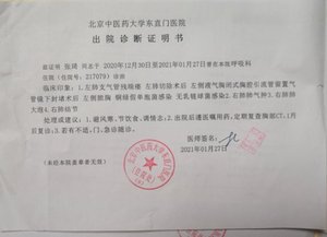北京中医药大学东直门医院出具的证明,证明张琦肺部有脓、被感染。(杜廷香和张琦提供)