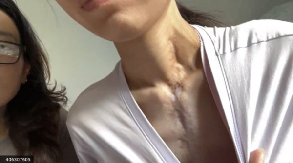 作为活摘器官的受害者,张琦说,她的气管因为没有缝合好,导致胸腔内部感染,里面积存有脓水。