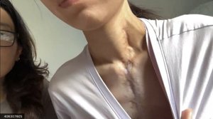 通过视频,张琦打开衣服让记者看,她胸前有从气管到腹部的手术长疤,还有一条从左胸到后背的刀痕,是她在不知情的情况下,被医生活摘了左肺;另外,她腋下赫然有一个大洞,每天必须换药清理。