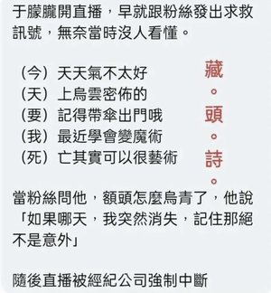 于朦朧在直播中說出「今天天氣不太好,要記得帶傘。我最近學會變魔術,死亡也可以很藝術」,每句句首文字連成「今天要我死」的藏頭句 (翻攝自抖音)