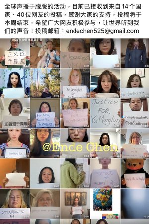 由海外中國民主黨舉辦的全球聲援于朦朧的行動,「讓世界聽到我們的聲音」,目前收到14個國家,來自40位網友的投稿。