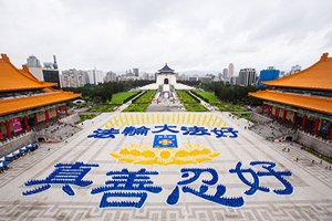 2020年12月5日,約5,400名法輪功學員在台北自由廣場排出九字真言「法輪大法好、真善忍好」圖像。(陳柏州/大紀元)