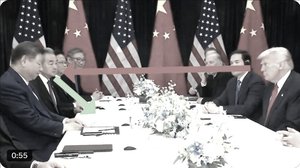 美国总统川普与中共党魁习近平在南韩会面。川普裂开嘴略有意味的笑看走哪都必须带著小本本的“小学生”领导人习近平。(视频截图)