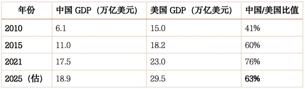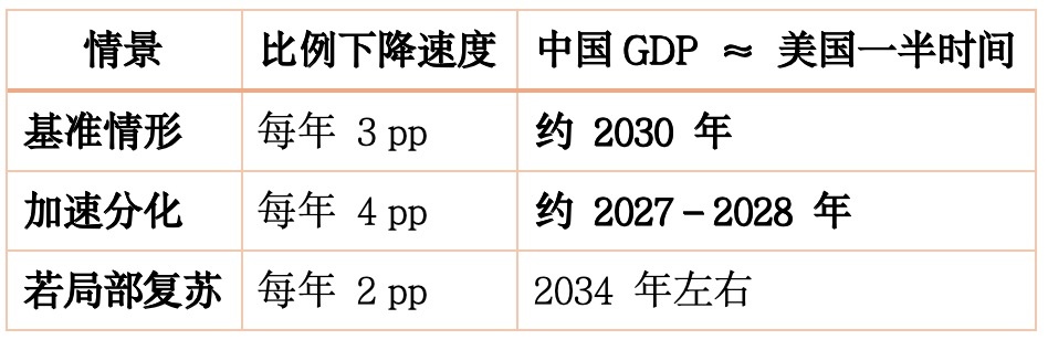 2.加速分化(例如人民幣貶值、科技增速差擴大):可能在2027–2028年,中國GDP就不到美國的一半。