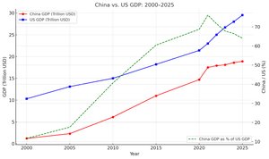 【人民報消息】2000年初,世界普遍相信「中國奇蹟」將改寫全球經濟格局,中國經濟總量將趕超美國;但21世紀20年代中期,歷史出現了出人意料的逆轉——不是中國在趕超美國,而是美國在大步甩開中國。 .在過去二十年,中美經濟關係經歷了一次歷史級反轉,如下圖: