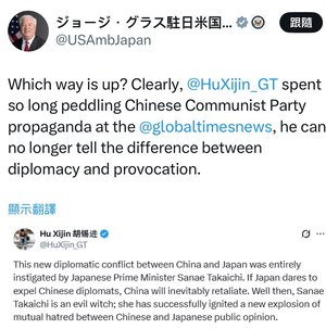 《環球時報》前總編輯胡錫進11月13日在X上發文遭到美國駐日大使葛拉斯(George Glass)反擊。(網絡截圖)