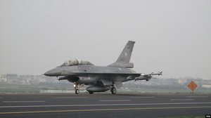 資料照片:2011年4月12日漢光27號演習,臺灣空軍401聯隊F-16B 6825戰機演習高速路上起降。