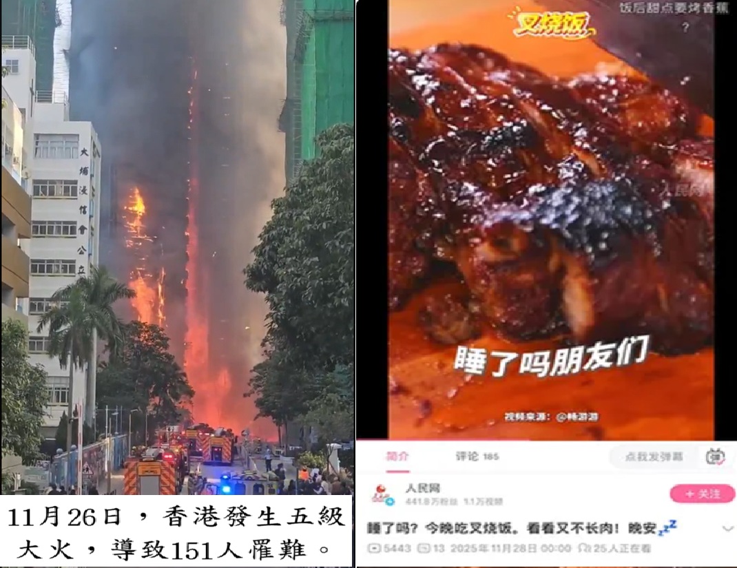 【人民報消息】香港大埔宏福苑11月26日發生五級大火,至少128人遇難,逾200人失蹤,是香港77年來最嚴重火災,全球民眾莫不感到震驚與哀悼。然而,中共官媒《人民網》竟在28日凌晨,在網路上發布影片「今晚吃叉燒」,還有一批小粉紅在評論區跟帖叫囂「香啊」,聽起來就如同于朦朧去世後,嫌凶之一的導演程青松發帖稱「好吃」一樣。難道在中共眼裡,中國民眾的死亡都被它看做是獻祭?