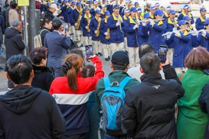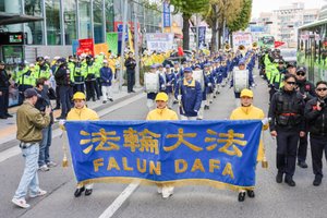 11月2日,韩国首尔中国人聚居地举行游行活动,庆祝超过4.5亿中国人退出中共党、团、队组织,图为打头阵的天国乐团在首尔警方协助下出发。(金国焕/大纪元)