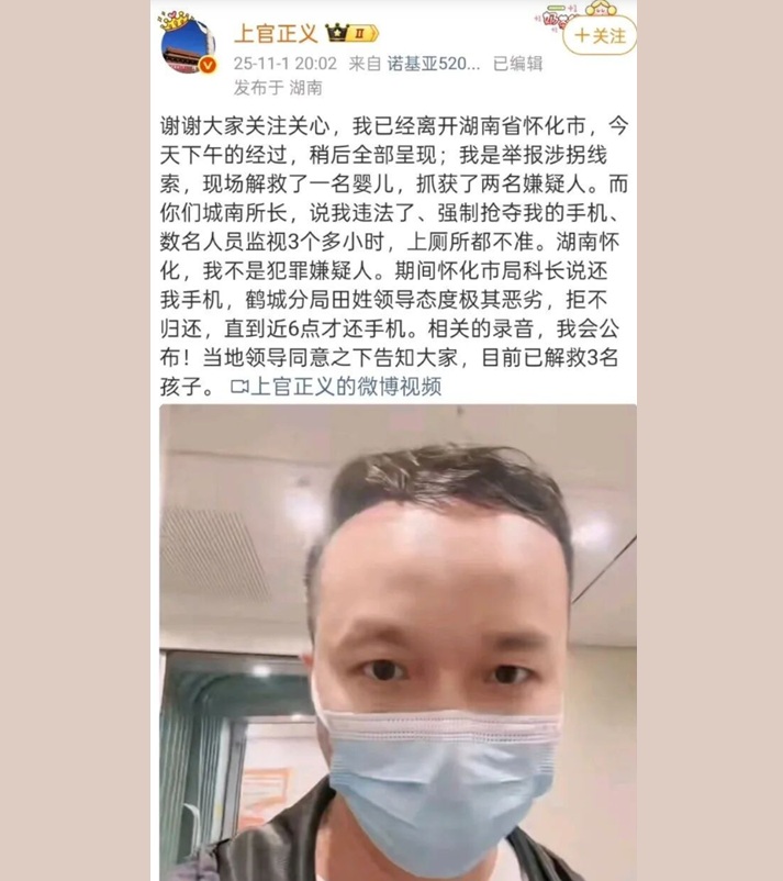11月1日中午,上官正義在個人微博帳號發文指出,懷化當地的袁姓女子,透過小紅書從生母手上低價買入嬰兒,再尋找買家以高價賣出,他在懷化報案後順利救出1名嬰兒,並且抓住了2名準備交易的仲介。