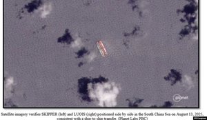 美國眾議院中國問題特設委員會主席穆勒納爾在2025年12月12日寫給財政部長貝森特的信中提供源自Planet Lab PBC的衛星圖像,證明兩艘油輪SKIPPER號(左)與LUOIS號(右)2025年8月13日在南中國海並排行駛,與船對船轉運相符。