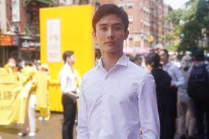 2025年7月20日,大纽约地区数千名法轮功学员在曼哈顿中国城举行“停止迫害法轮功”大游行。数百名神韵艺术家及工作人员组成的方阵也加入到游行队列。图为神韵主要领舞演员孙弘威接受媒体采访。(Mark Zou/大纪元)