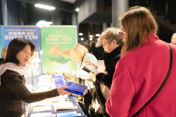 2025年12月18日,观众在阿姆内维尔大剧院(Galaxie Amnéville)内购买神韵商品和《转法轮》等书籍。(章乐/大纪元)