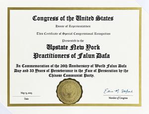 埃莉斯‧斯特凡尼克(Elise Stefanik),國會眾議院共和黨會議主席、紐約州第21選區聯邦眾議員,向紐約上州法輪大法修煉者頒發美國國會特別褒獎證書,「以紀念第26屆世界法輪大法日,及(大法修煉者)在中共迫害之下堅守33年」。