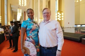 2026年1月18日下午,美国有线电视与宽带协会(NCTA)技术副总裁、美国能源部前高级官员Robert Cantu(右)和一家公司的首席数据工程师Giada Garnett观看了神韵世界艺术团在华盛顿DC肯尼迪艺术中心歌剧院的第十场演出。(李辰/大纪元)