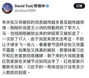 沒過多久,他又再度發帖說:「張副主席的兒子,也被帶走了,還戴著黑頭套,極具羞辱的意味......」
