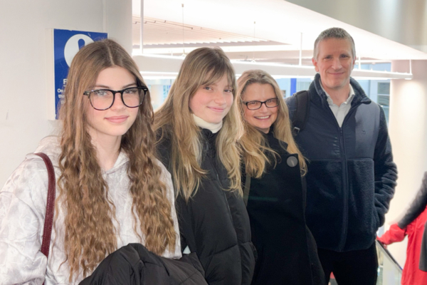 2026年1月4日下午,Catherine Davies(右二)和丈夫Andrew Davies(右一)携两个女儿观看了神韵环球艺术团在英国伯明翰ICC(The ICC Birmingham–Hall 1)的最后一场演出。(李明/大纪元)