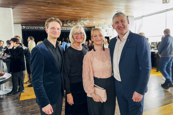 2026年1月4日下午,神韵巡回艺术团在拉脱维亚首都里加(Riga)的戴列斯剧院(Dailes Theatre)上演了今年的第三场演出。拉脱维亚高级警司Jānis Blumbergs(右一)和太太Agnes(右二)、艺术家Mikus Krastiņš(左一)以及岳母一起观看了演出。(王亦笑/大纪元)