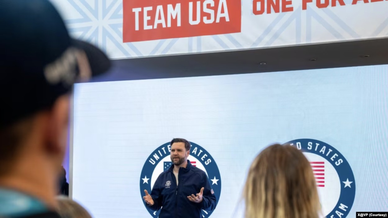 资料照片:2026年2月5日,美国副总统万斯在义大利米兰冬奥会美国队欢迎体验活动上发表讲话。