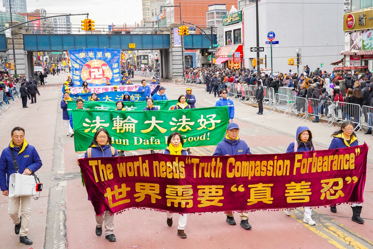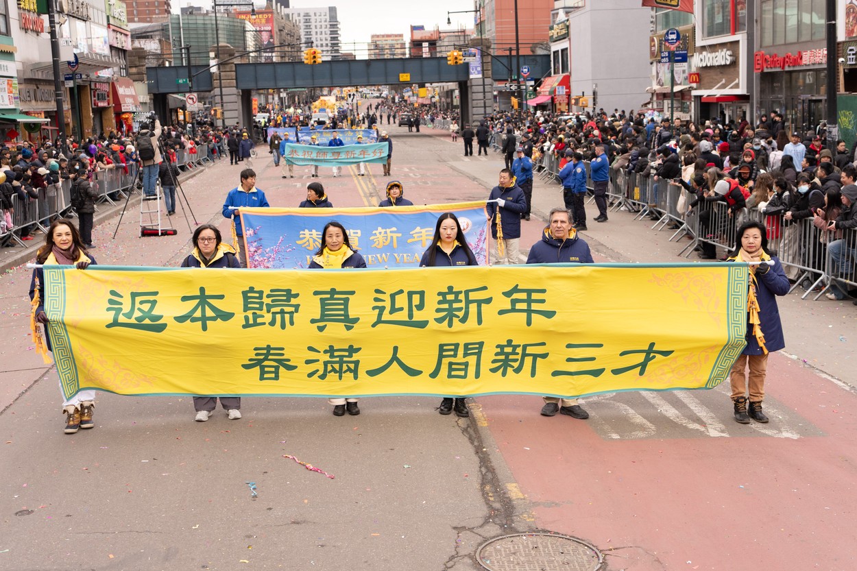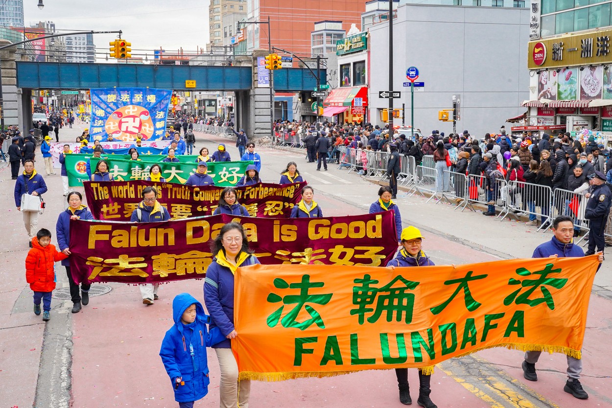 2026年2月21日丙午马年大年初五,法轮功学员参加纽约法拉盛中国新年游行,带去美好和祝福。(张静怡/大纪元)