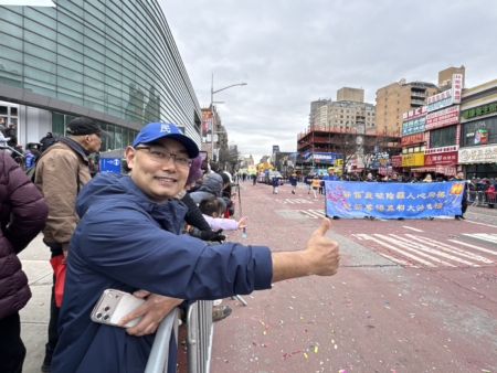 2026年2月21日丙午马年大年初五,法轮功学员参加纽约法拉盛中国新年游行,带去美好和祝福。(戴兵/大纪元)