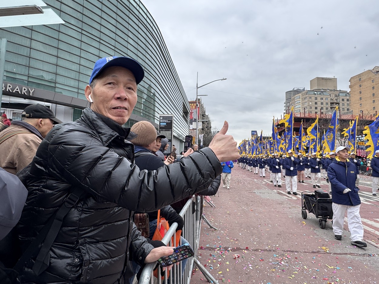华人杜海荣看到法轮功队伍出现后,眼睛湿润了。他激动地说:“非常雄壮!非常震撼!我每年最期待的就是法轮功的队伍!”