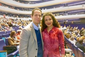 2026年3月7日晚,藝術公司老闆Beatriz Díaz女士與技術經理Carlos Fito López先生在瓦倫西亞的西班牙索菲亞王后藝術歌劇院(Centro de artes escénicas en Valencia, Palau de les Arts) 一起觀賞了美國神韻紐約藝術團本演季在當地的的第一場演出。(Maya Marinova/大紀元)