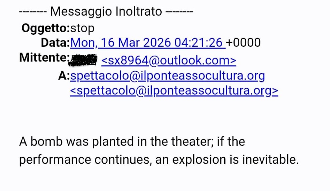 意大利的神韵主办方负责人Katerina Angelakopoulou女士说,3月16日凌晨04:21时,他们收到了一封来自[email protected]的英文电子邮件,里面对神韵演出发出威胁,中文翻译为:“剧院内已安放炸弹;若演出继续进行,爆炸将不可避免。”