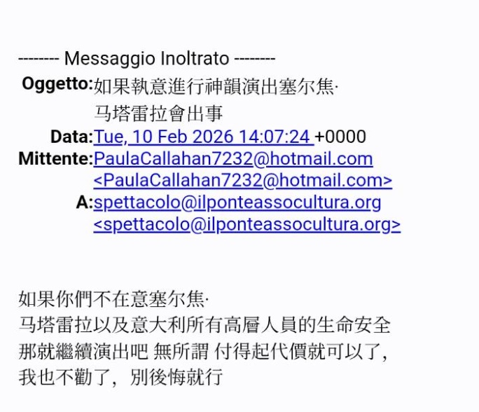这是中共对意大利主办方多次威胁中的最新一次。在2月份神韵演出期间,他们收到另一封来自不同发件人的威胁邮件,邮件题目用中文写道:如果执意进行神韵演出,塞尔焦‧马塔雷拉会出事。内容也是中文:“如果你们不在意塞尔焦‧马塔雷拉以及意大利所有高层人员的生命安全,那就继续演出吧,无所谓,付得起代价就可以了,我也不劝了,别后悔就行。”