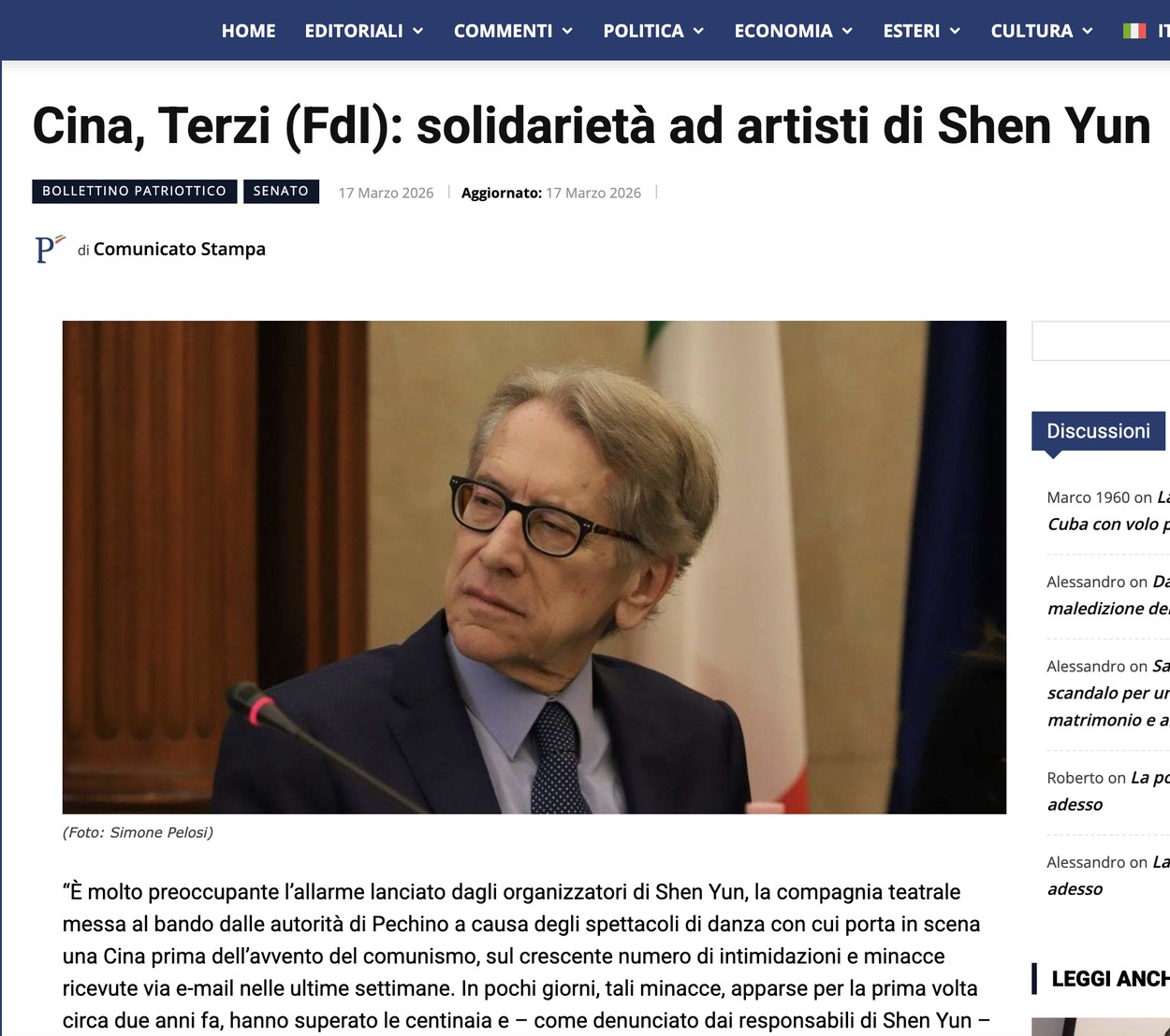 意大利前外交部长、参议员Giulio Terzi是位资深政治家,曾担任意大利驻美国大使、意大利驻联合国常驻代表等。Tezi对神韵的支持信,在意大利多家媒体刊登。