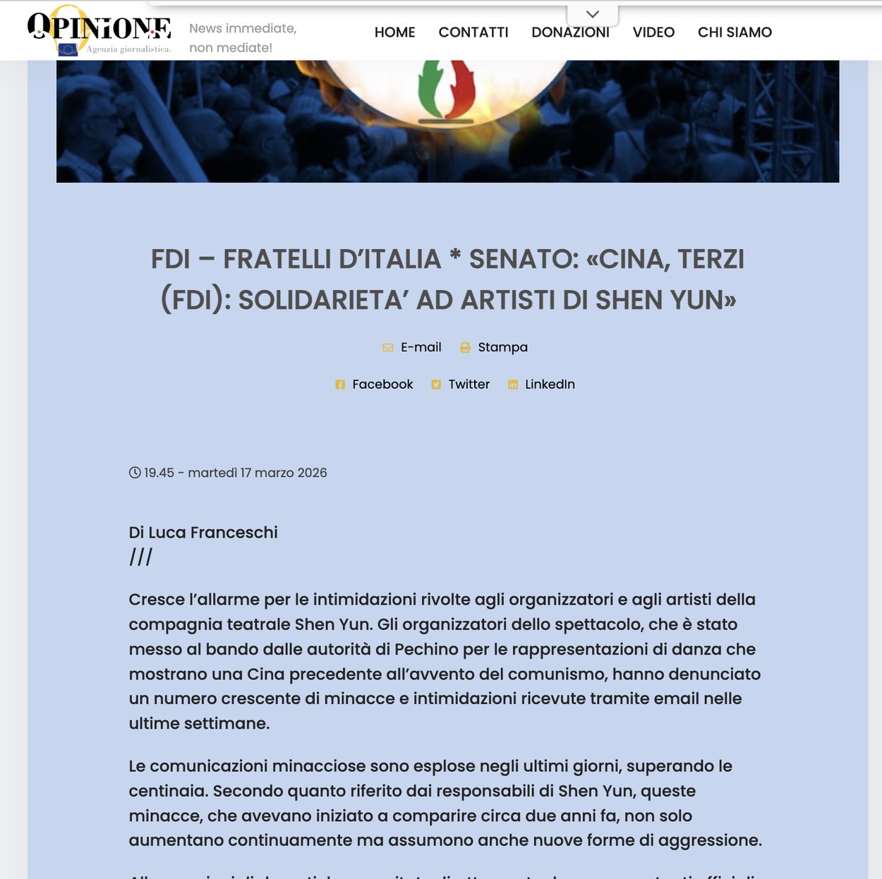 【人民报消息】3月16日,神韵纽约艺术团今年在罗马第二轮演出的前一天,主办方接到中共的恐吓信件后,当即向警方报案。主办方表示,中共对神韵、对中国人民和对意大利人民的威胁,“是绝对不可接受的!意大利人民守护著自己的文化,并无所畏惧地抵制这些威胁”。