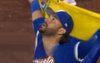 委內瑞拉棒球隊贏球後,一名隊員披上國旗,高舉雙臂,跪在地上,仰頭感謝上帝。(視頻截圖)