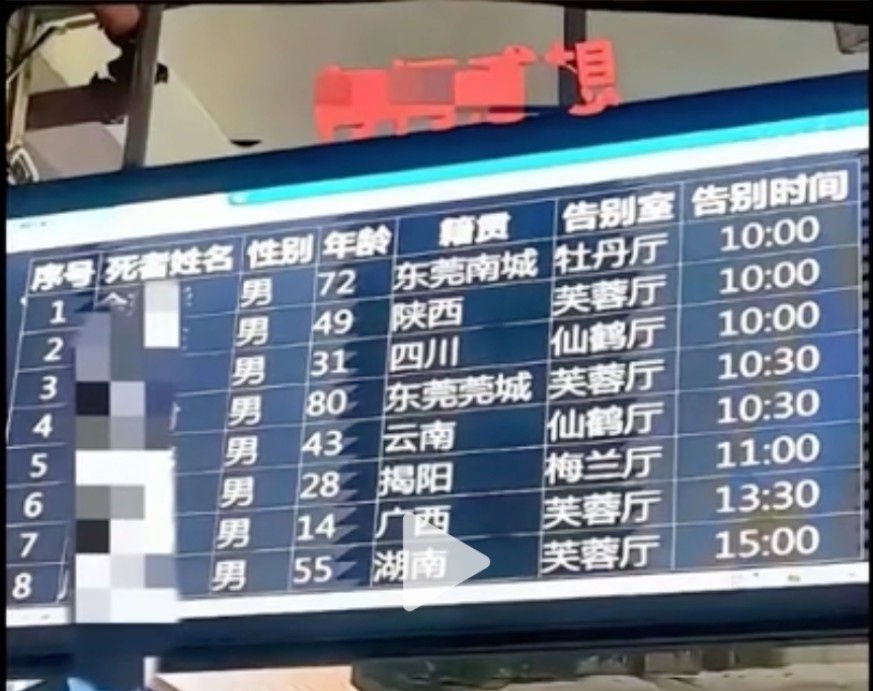 2025年3月,廣東東莞一家殯儀館的電子屏幕。(網絡圖片)