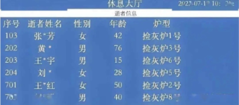今年3月,大陸網友傳出一張未註明城市的殯儀館電子屏幕截圖,顯示年輕人死亡率也頗高,只有一名死者在60歲以上,其餘5人都沒超過50歲,最年輕的只有15歲。
