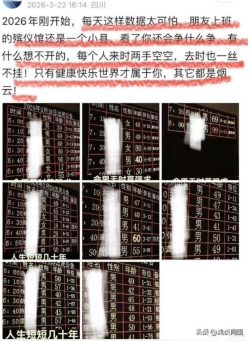 該網友在帖文中感嘆:「2026年才剛開始,每天目睹這樣的數據實在太可怕。這僅僅是朋友上班的一個小縣城而已。看完這些,還有什麼好爭奪、好想不開的?每個人來到世上時兩手空空,離去時亦一絲不掛!唯有健康快樂時,世界才屬於你,其餘皆如雲煙!」