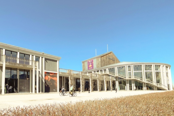 2026年4月8日下午,神韻環球藝術團在德國菲森新天鵝堡音樂廳(Festspielhaus Neuschwanstein)上演了今年當地第二場演出。這天,陽光明媚,春意盎然。圖為懸掛巨型展板喜迎神韻的新天鵝堡音樂廳外景。(君卓/大紀元)