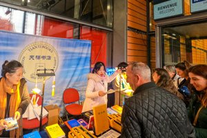 2026年4月12日下午,觀眾觀賞神韻演出結束後,購買法輪大法書籍。(傅潔/大紀元)