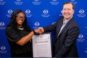 2026年4月12日下午,纽约市议会副议长Nantasha Williams在林肯中心大卫寇克剧院(The David H. Koch Theater)向神韵纽约艺术团颁发褒奖状。(新唐人电视台)