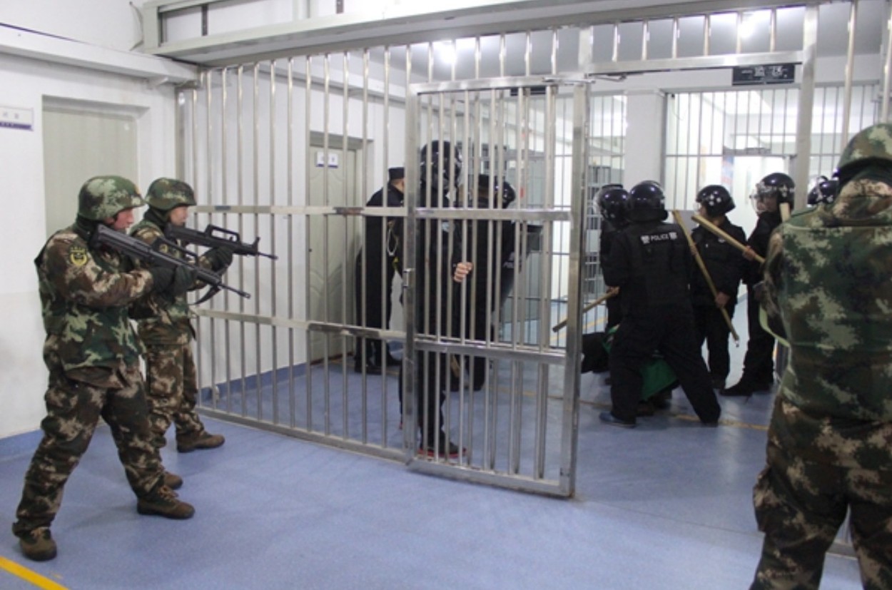 在外洩的照片中,新疆集中營的武裝人員,以突擊步槍指向在押人員。 (鄭國恩X截圖)