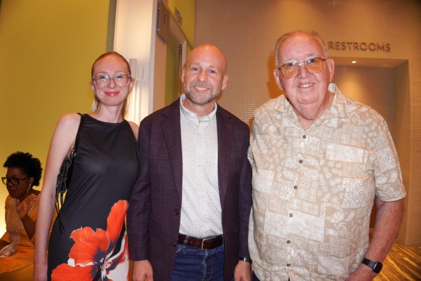 2026年4月27日晚,在美國奧蘭多菲利普斯博士演藝中心(Dr. Phillips Center for the Performing Arts),影片製作人、作家John Bomhoff(右)與兒子、高級副總裁Mark Bomhoff(中)一同觀看了神韻新世界藝術團在當地的首場演出。(林南宇/大紀元)